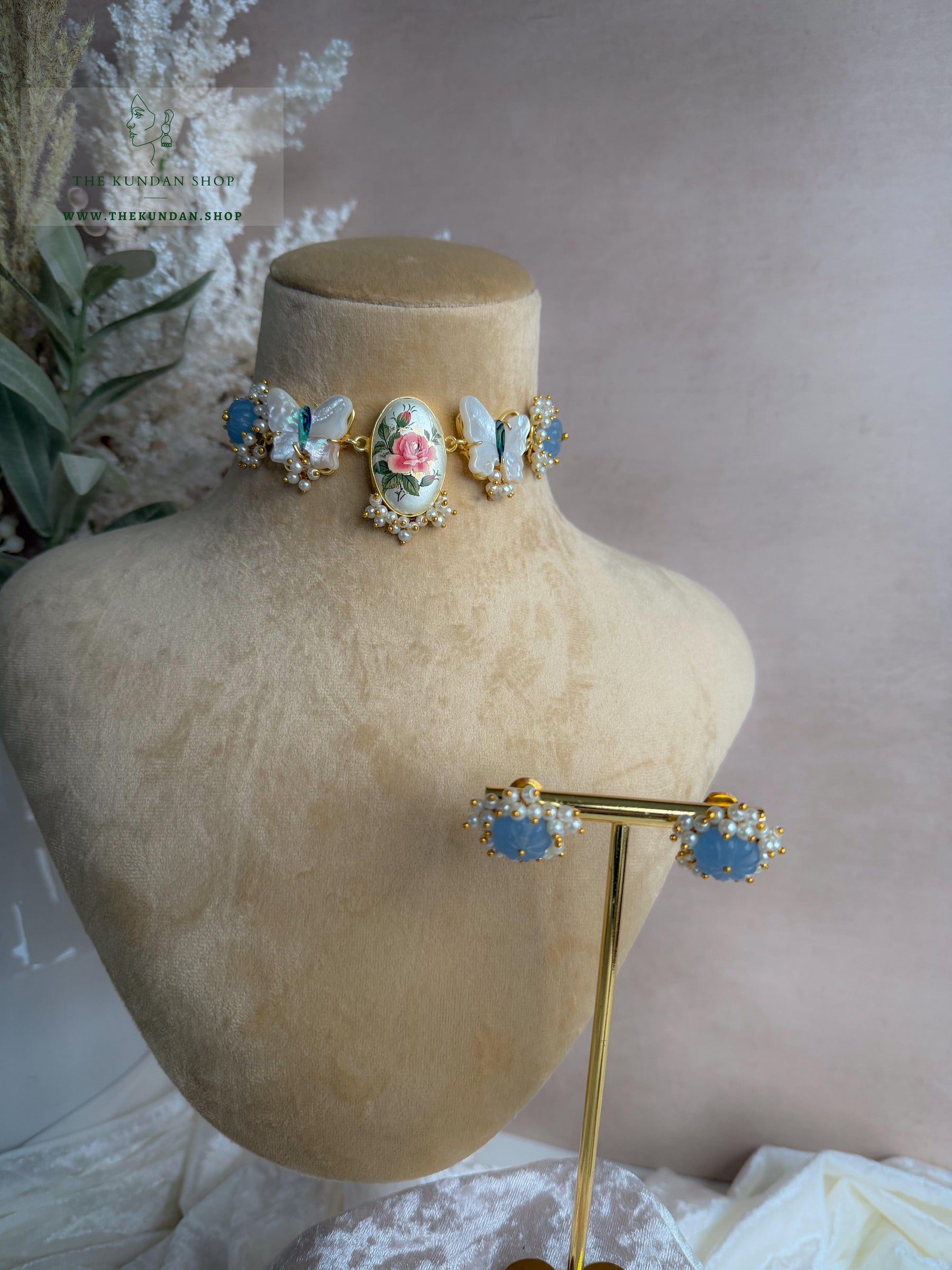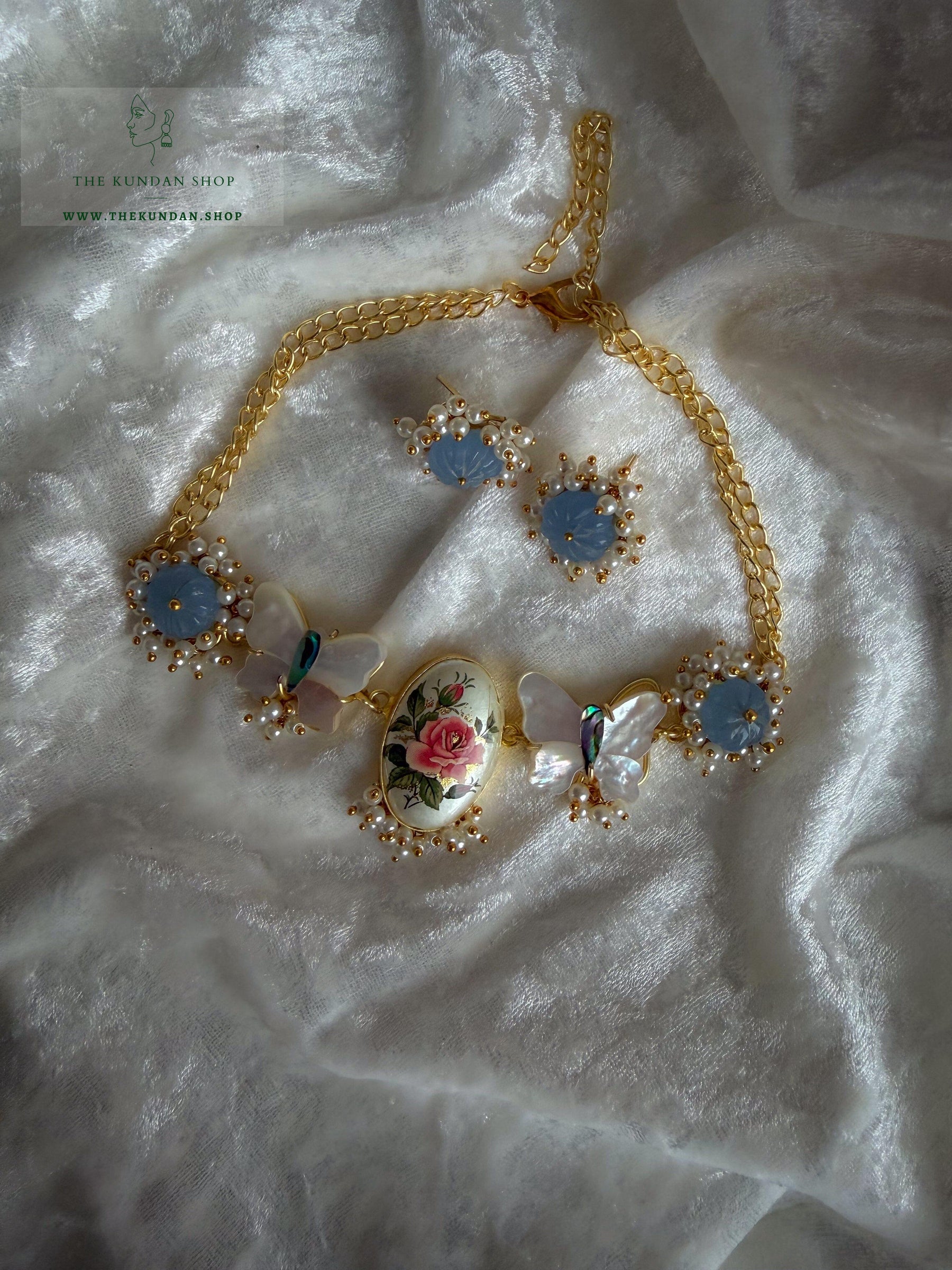 Stunning multi pendant mother of pearl and floral necklace set with butterfly shaped pendant and matching stud earrings.