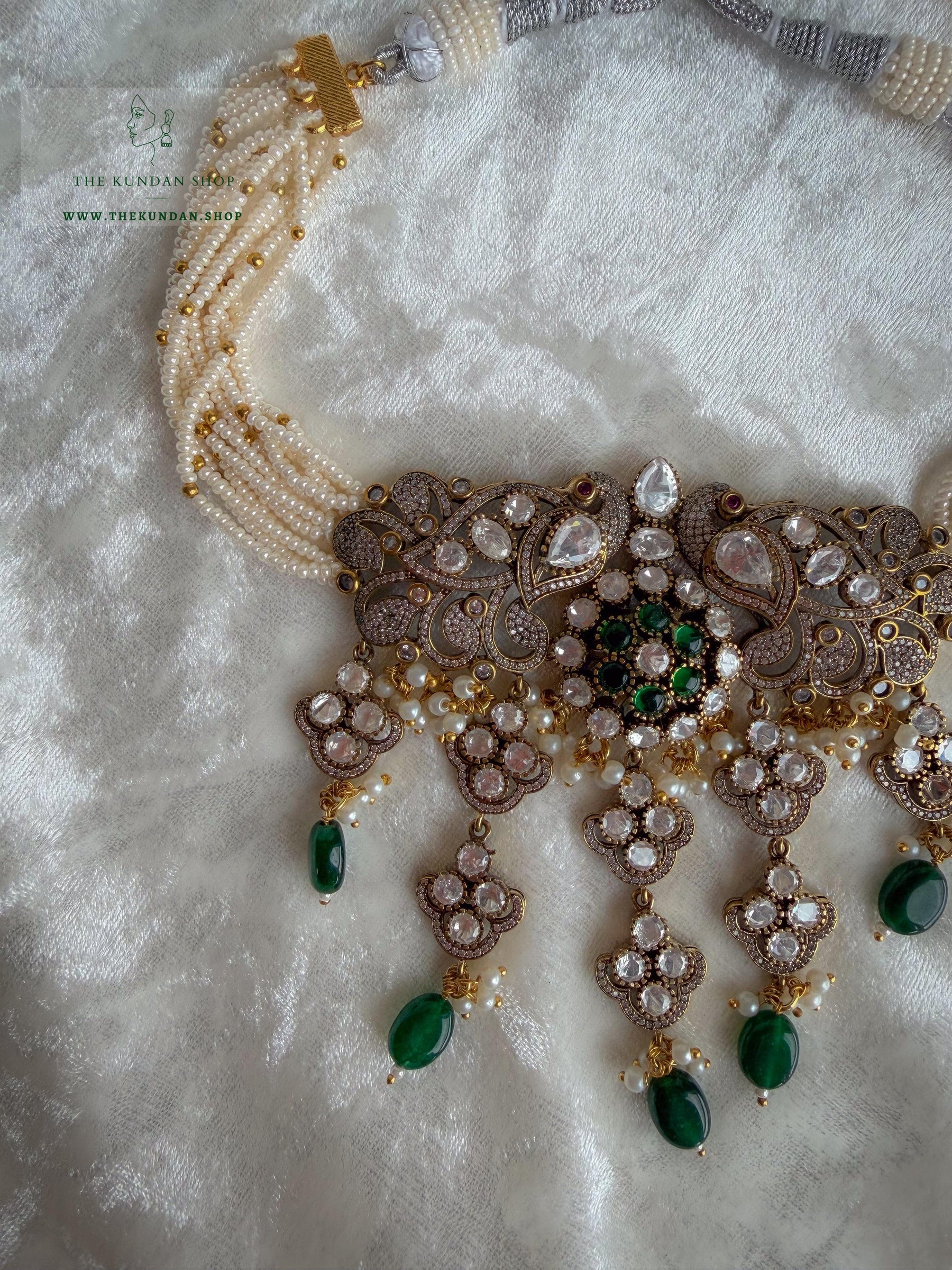 Beautiful kundan choker set with drop green beads, comes with matching earrings.